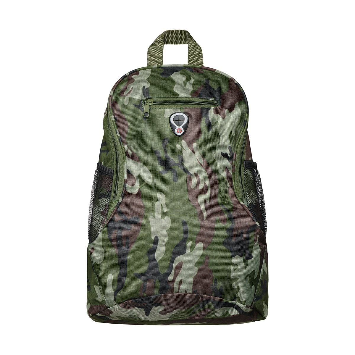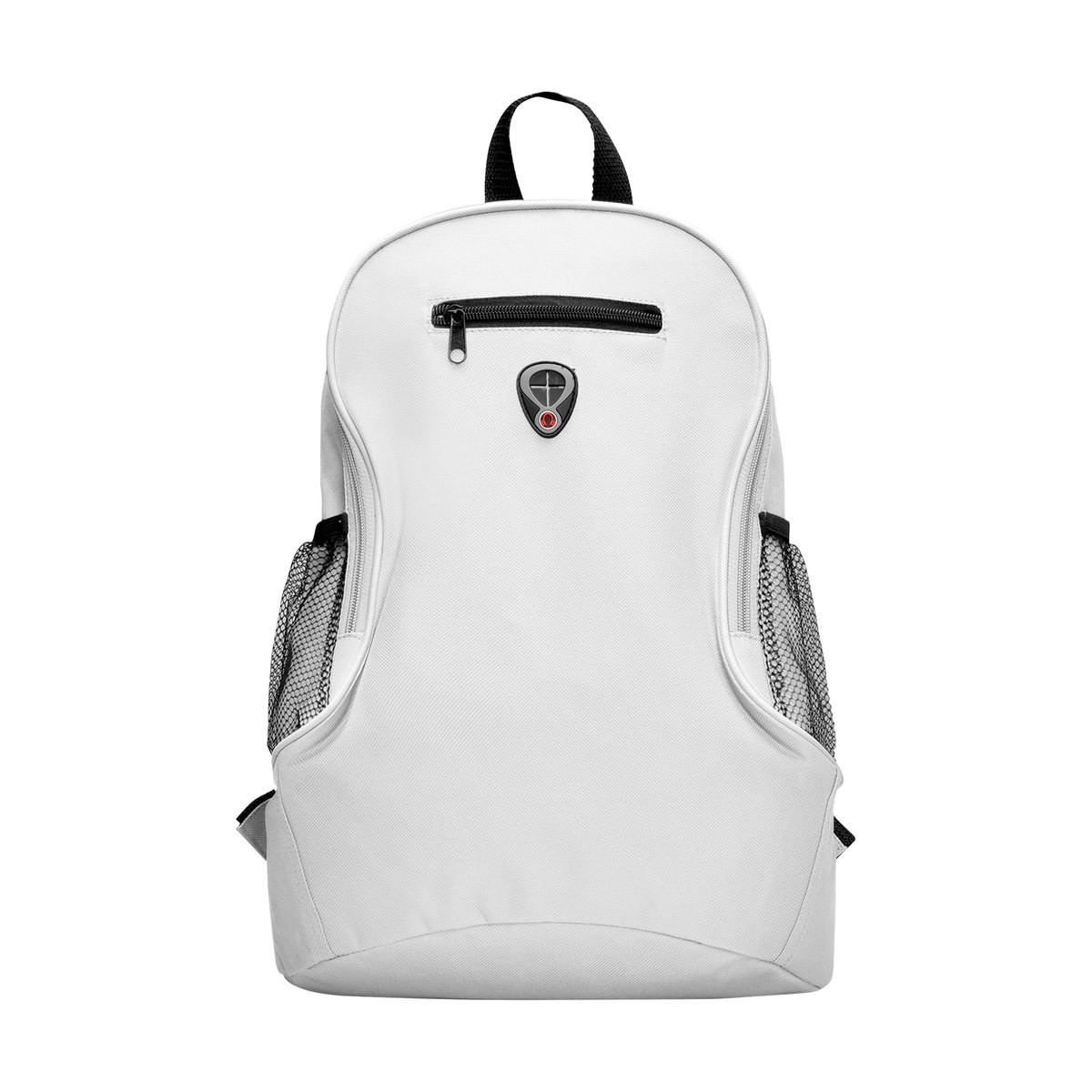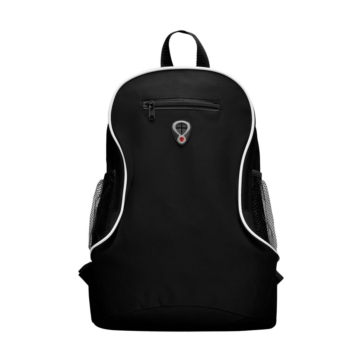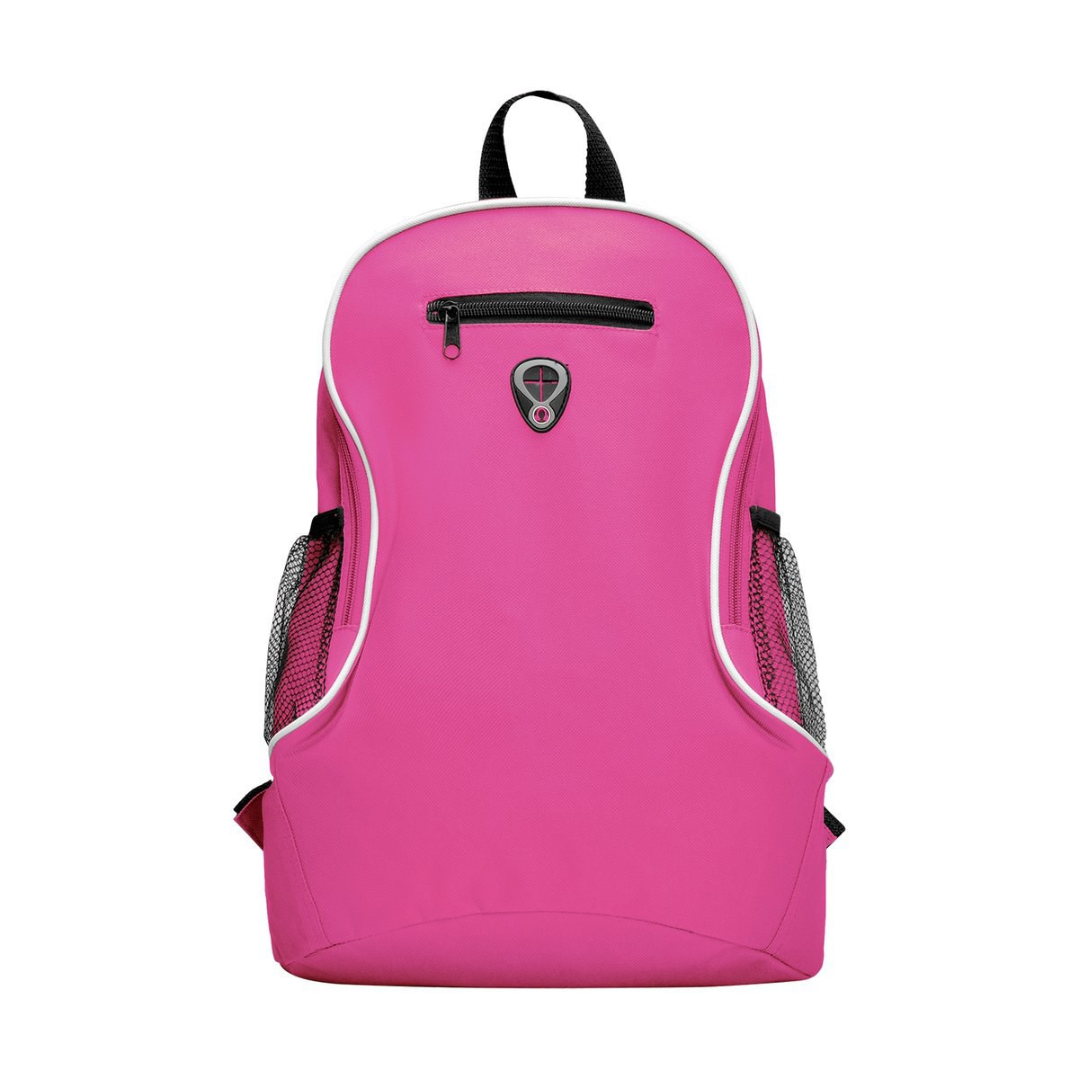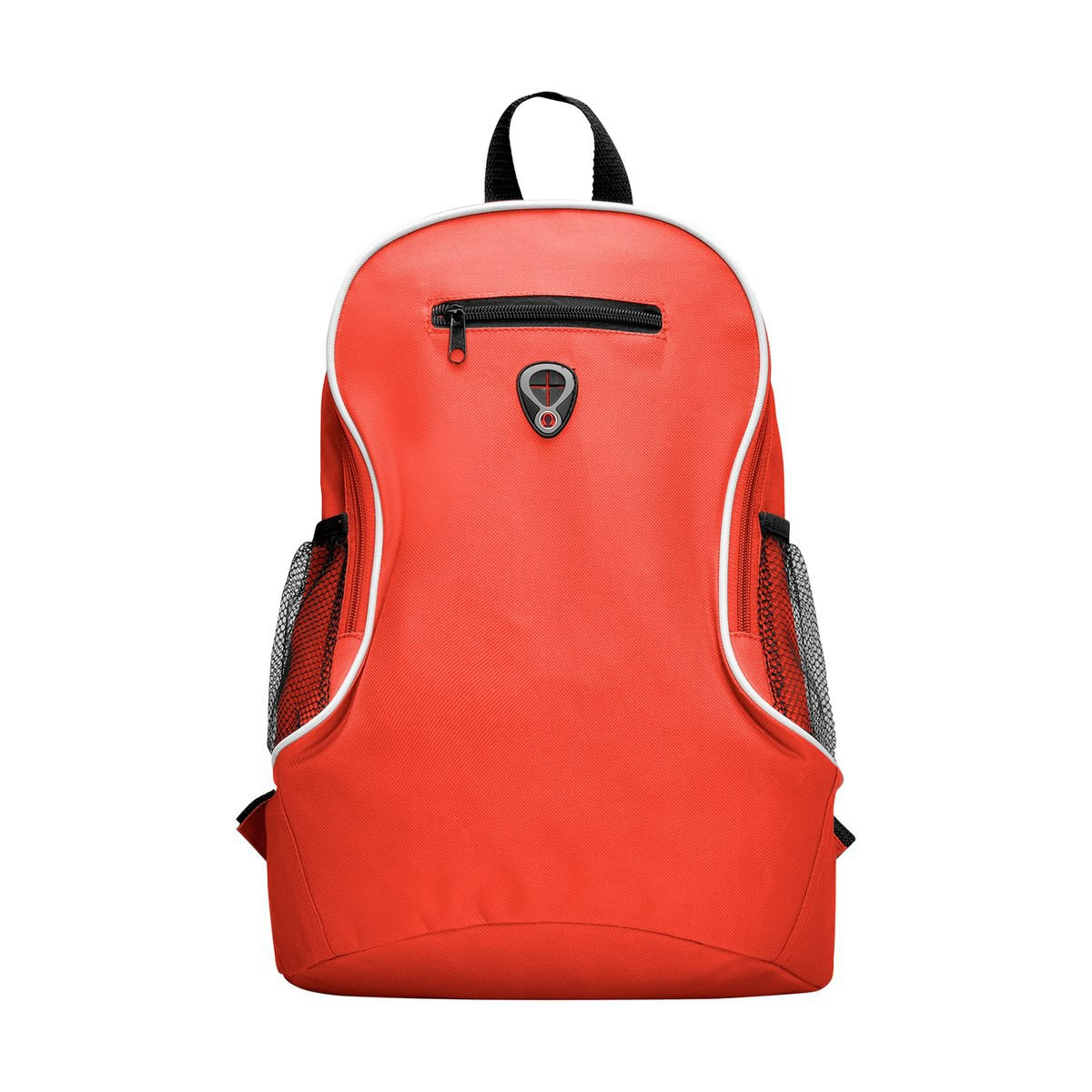 Resistant 600D polyester backpack in bold design, with zipper closure, headphones outlet, front pocket and elastic webbing pockets on the sides. Accessories in black, with adjustable shoulder straps with padding.