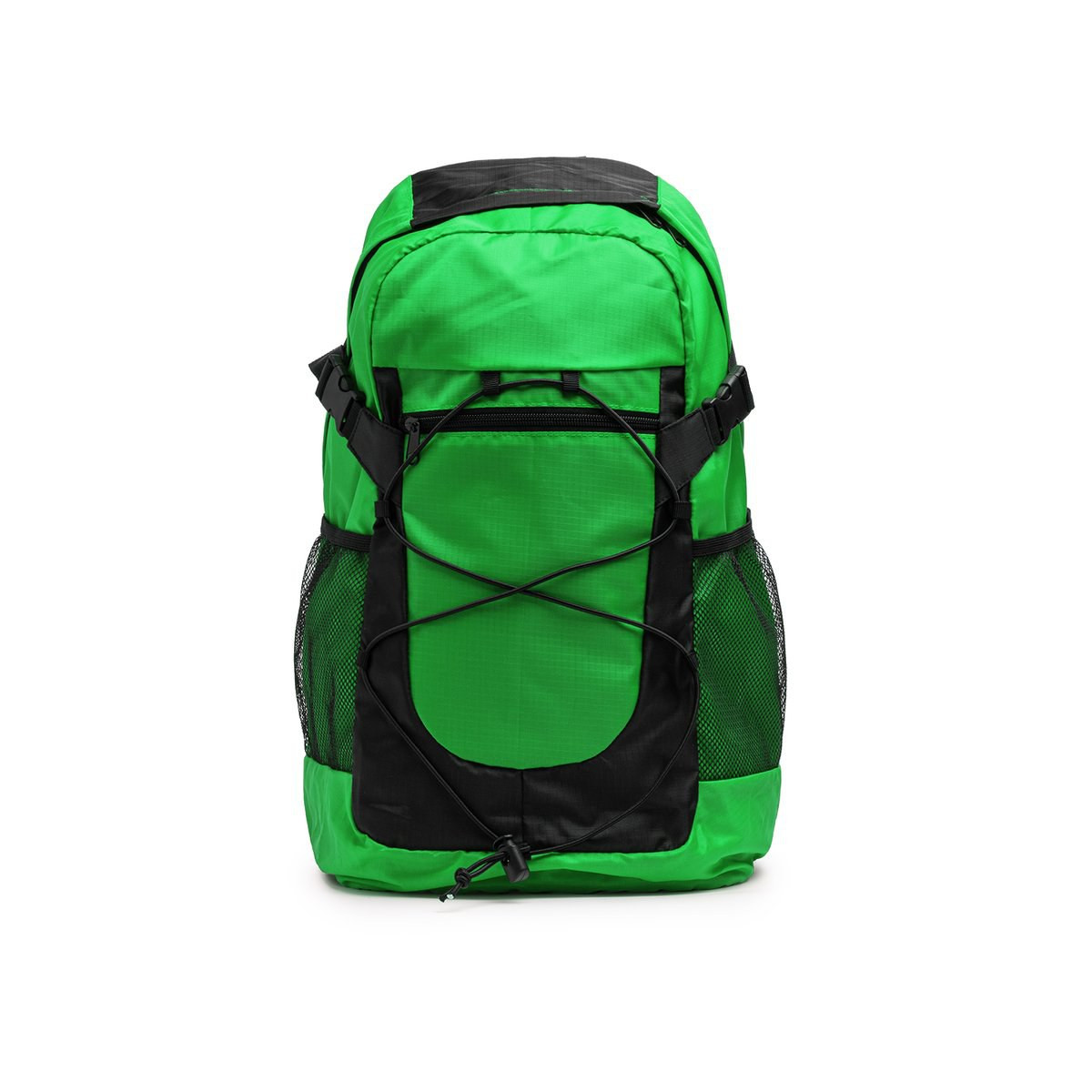 Sports backpack in high strength 210D ripstop nylon. Capacity 30 litres. Double main compartment with zip closure and internal pockets. Front compartment with bungee cord and side mesh pockets. Padded back and shoulder straps. Adjustable side buckles.