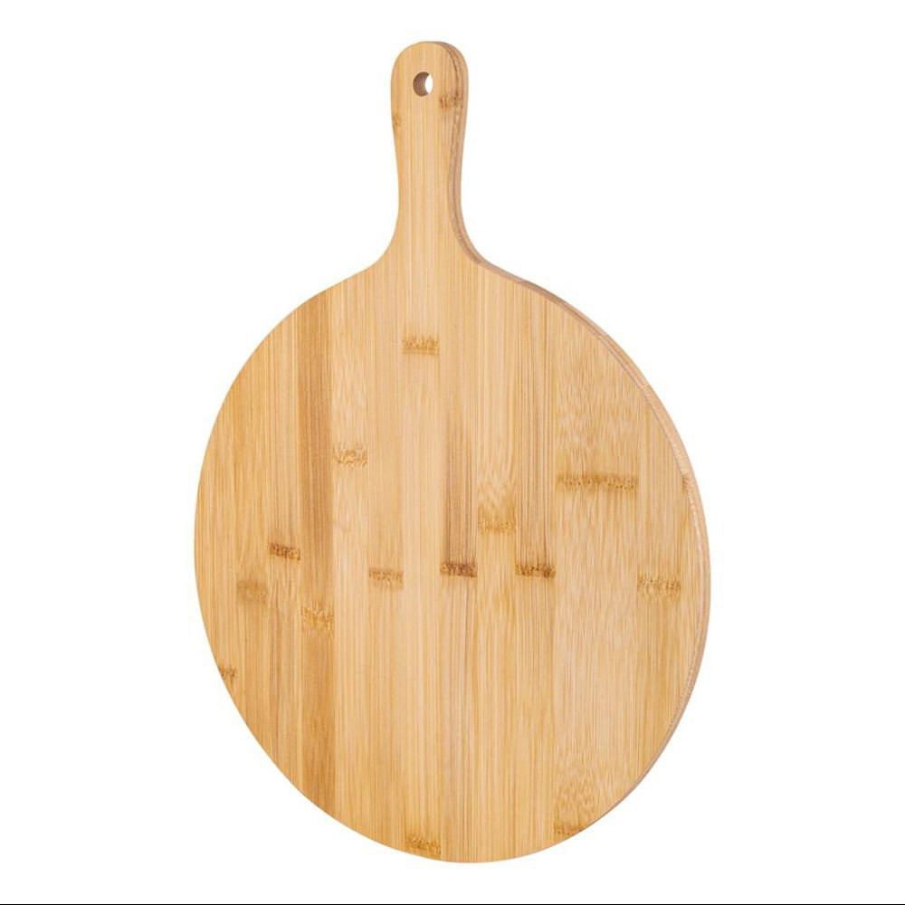 Round bamboo cutting board, with handle and smooth finish. Presented with a kraft paper band.