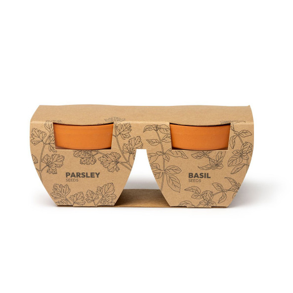 Set consisting of two clay pots with parsley and basil seeds. Growing medium included. Made in Europe.
