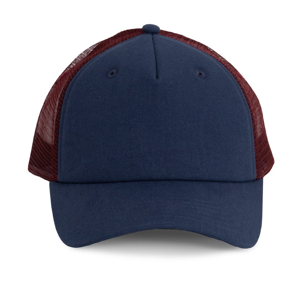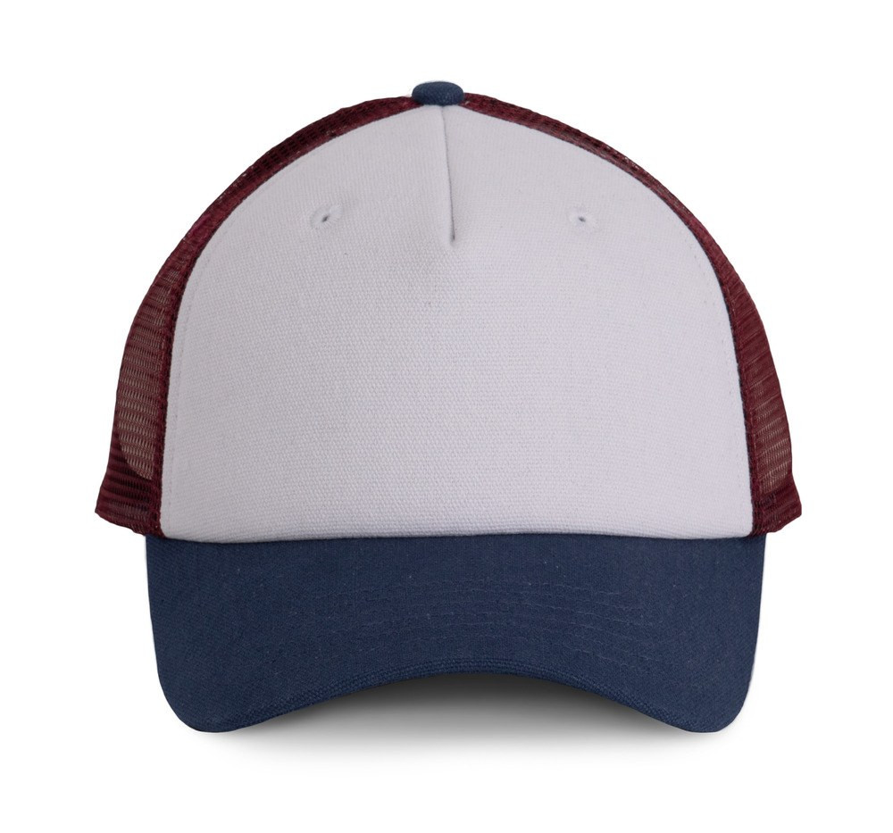 The Trucker Cap - 5 panels KP170 from the k-up brand is available in three different colors including: indigo / wine, white / indigo, / wine and river blue / dark gray / black gray .