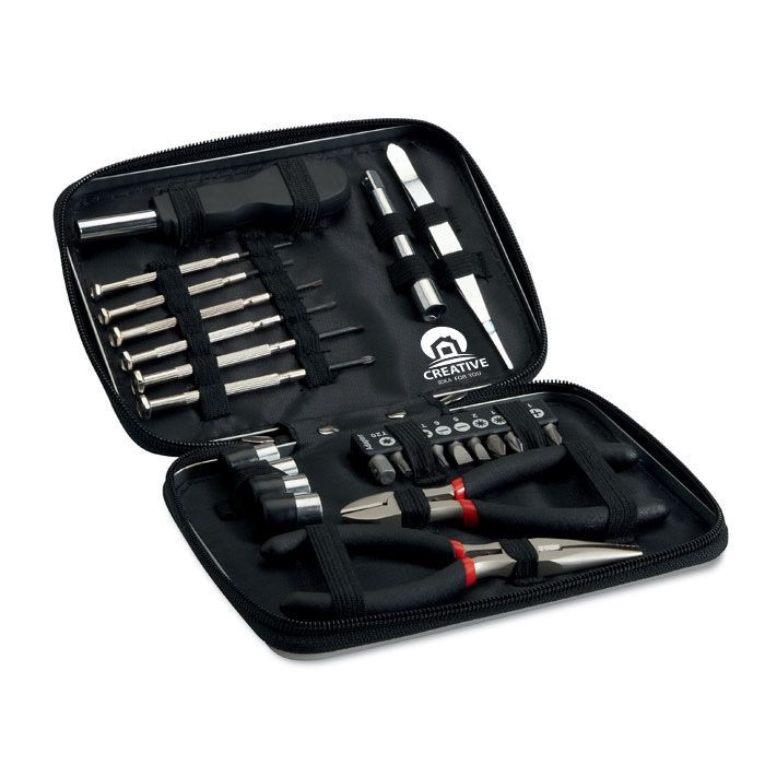 Always be prepared with this tool set in an aluminium box containing 1 pair of pliers, 1 pair of wire cutters, 1 screwdriver, 1 extension, a set of 10 bits, 1 pair of mini pliers and 6 precision screwdrivers.