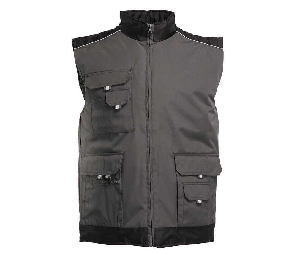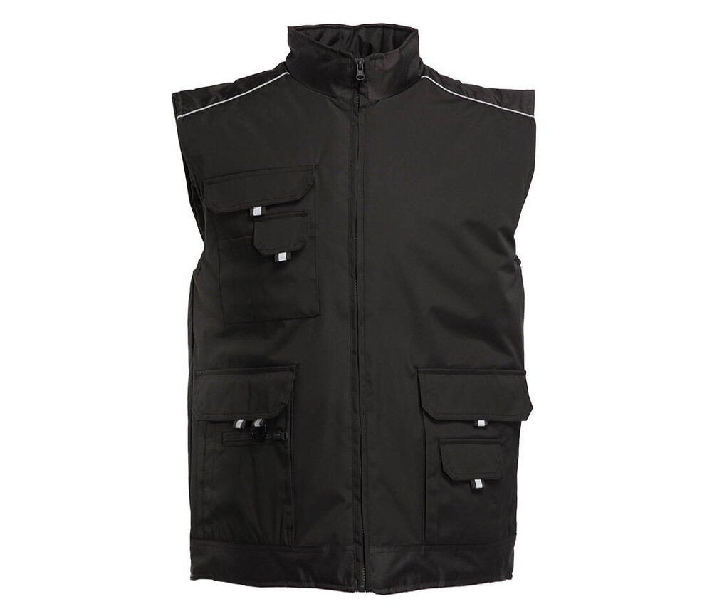 300% polyester. Oxford 330D yoke on shoulders, collar and hem. Windproof and waterproof. 11 outer pockets (1 zipped front pocket, 4 Velcro® pockets, 2 side pockets, 3 pen pockets, 1 smartphone pocket). Reflective strips shoulders and pockets.
