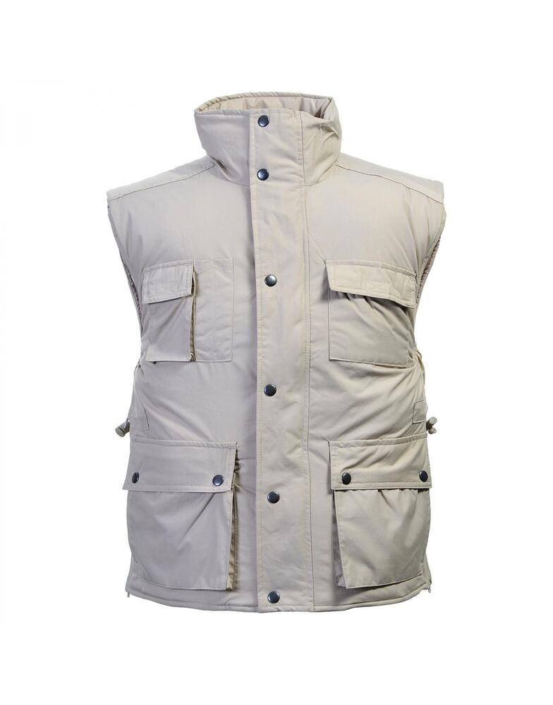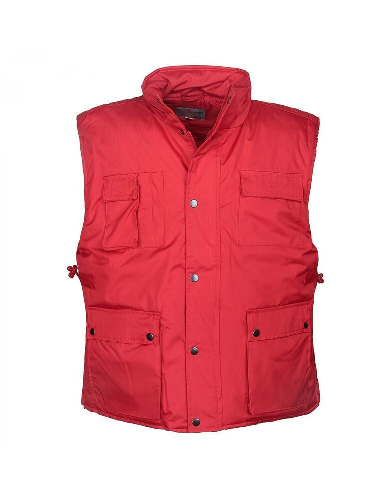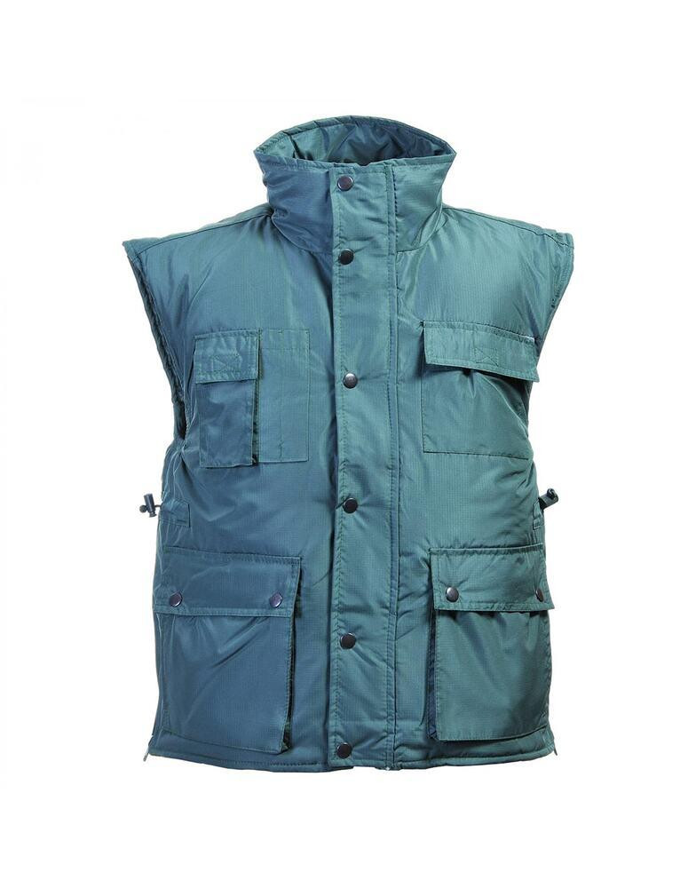 Bodywarmer polyester ripstop. Polyester Lining with fleece. Sider zippers. Vest with polyster ripstop with padding. Multi-pockets: 1 large pocket for documents under the central flap - 1 zipped chest pocket left side closed by flap and Velcro - 2 3D patch pockets with flaps and pressure + vertical pockets - - 1 zippered pocket hidden under the right side flap - 1 chest pocket + mobile phone right side pen holder 2 zip on the sides - elasticated armholes - Back longer - zip opening for brand.