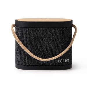 Wireless speaker with bamboo structure and recycled RPET polyester.