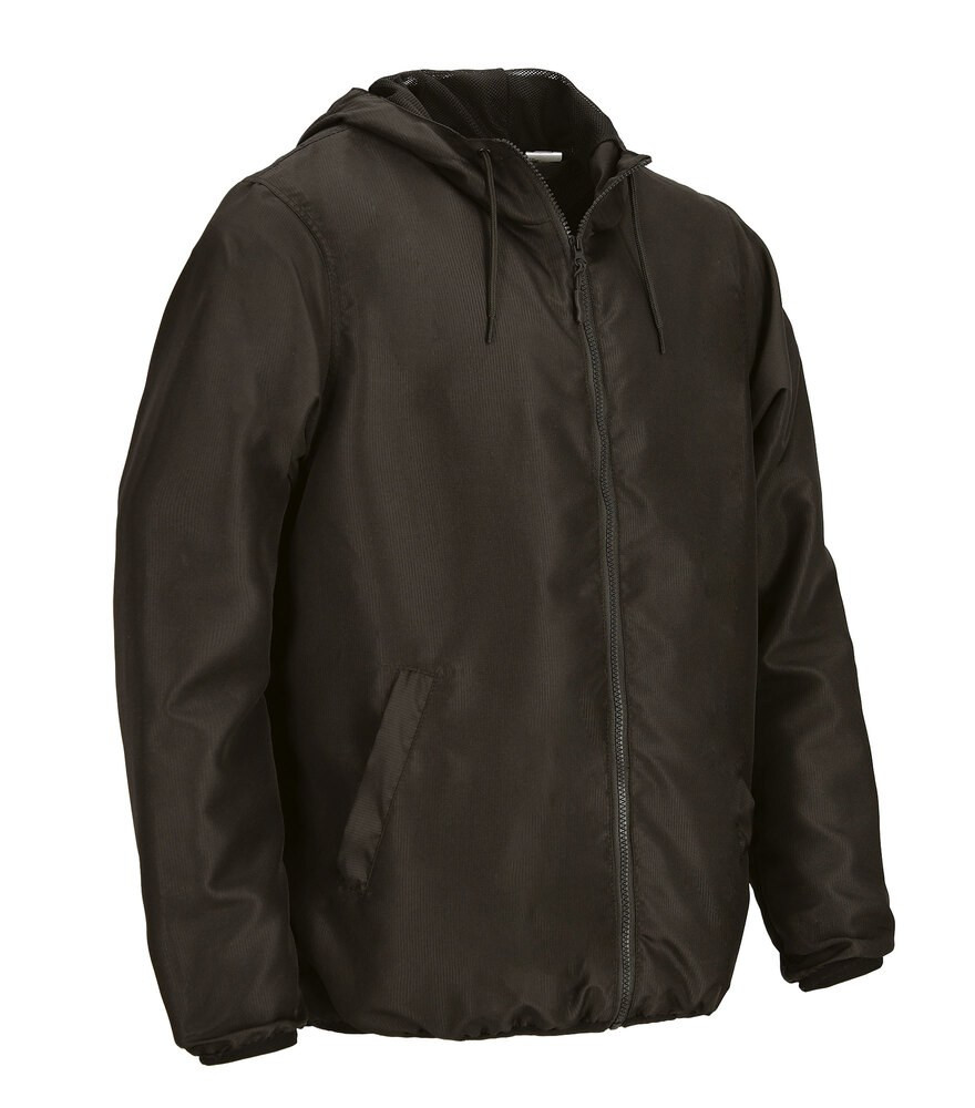 Windbreaker Hooded Jacket. Made of double fabric: lightweight and breathable checked microfiber outer fabric that effectively blocks wind penetration and an inner mesh that enhances breathability. Double layer hood with drawstrings for a better fit and zip closure for added comfort.Elasticated cuffs and waistband for comfortably fitting.Two slanted zippered waist pockets for convenient storage. Suitable marking methods: screen printing, embroidery, transfer printing, vinyl application.Ideal as sportswear and for outdoor activities.
